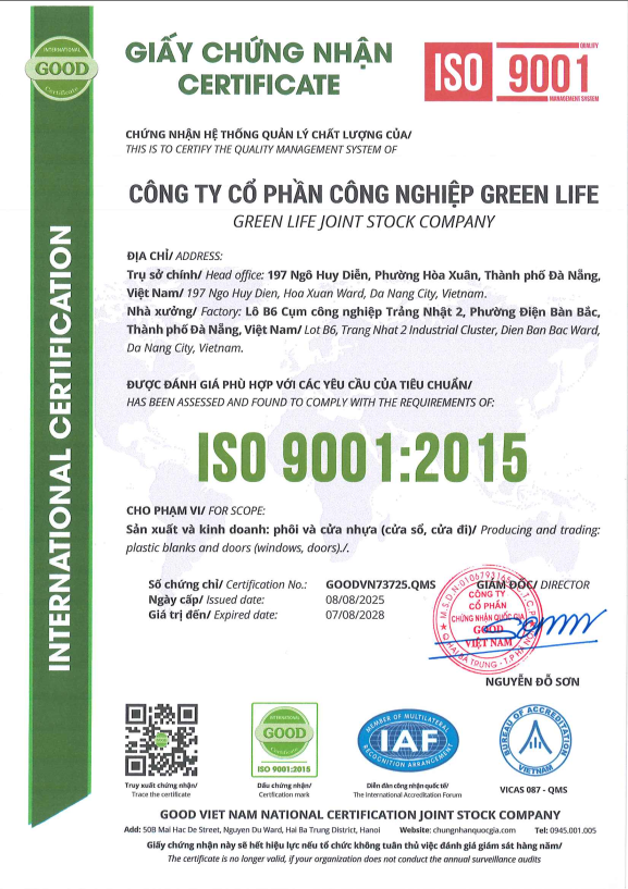 Chứng nhậnCHỨNG NHẬN ISO GREEN LIFE Đăng vào 3 Tháng 10, 20256 Tháng 10, 2025 bởi GREEN LIFE 03 Th10 Post Views: 80 GREEN LIFE TOP 3 LÍ DO NÊN CHỌN CỬA GỖ NHỰA COMPOSITE GREEN LIFE – GIẢI PHÁP SANG TRỌNG CHO MỌI KHÔNG GIAN SỐNG KẾT QUẢ KIỂM NGHIỆM CHẤT LƯỢNG PHÔI GREEN LIFE
