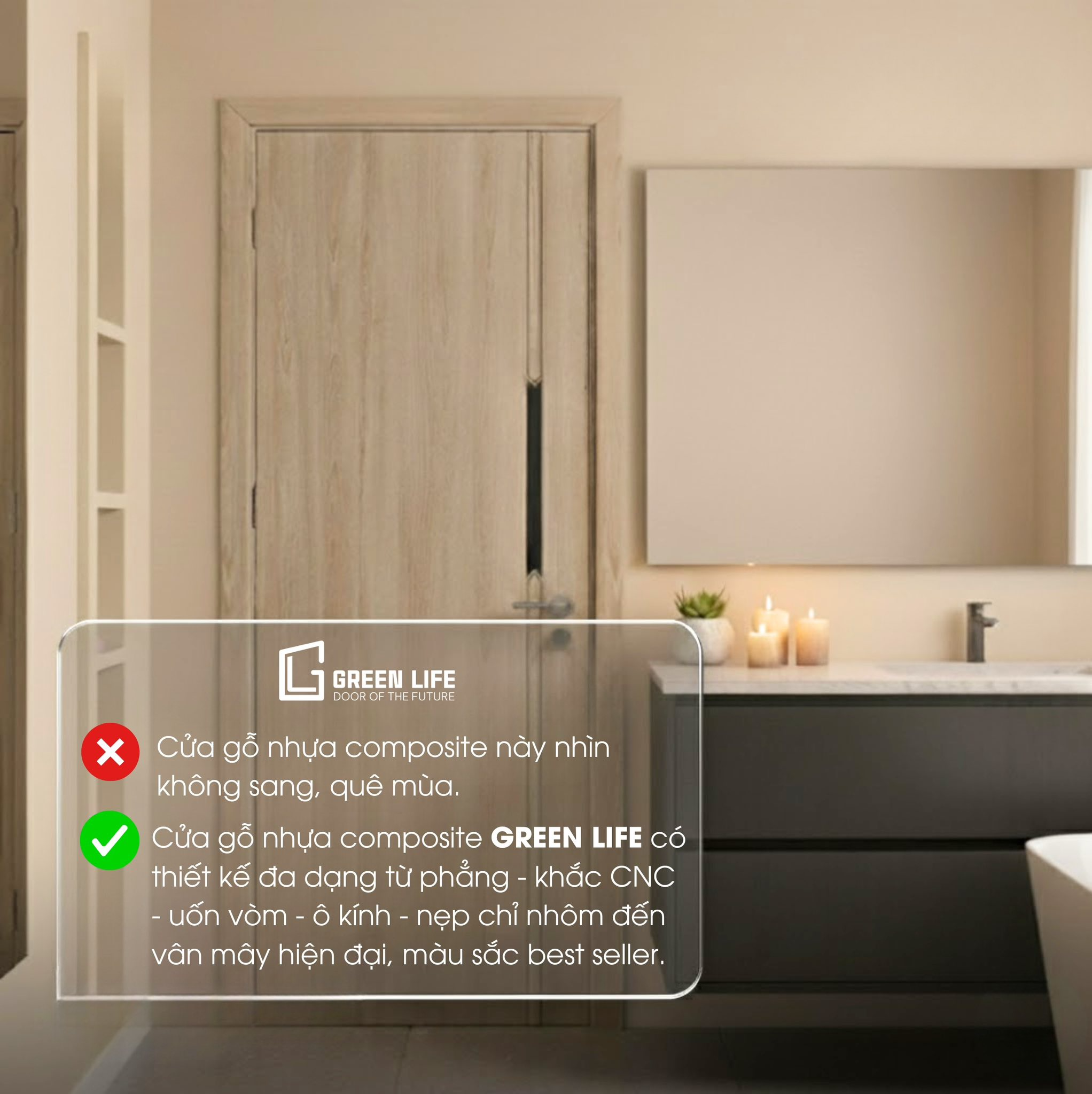 Với triết lý phát triển lấy chất lượng làm cốt lõi – thẩm mỹ làm giá trị gia tăng, Green Life không ngừng đổi mới để mang đến những sản phẩm cửa gỗ nhựa composite chuẩn chất lượng, chuẩn đẳng cấp cho mọi công trình.