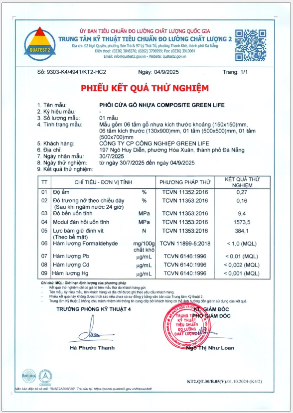 Chứng nhậnKẾT QUẢ KIỂM NGHIỆM CHẤT LƯỢNG PHÔI GREEN LIFE Đăng vào 3 Tháng 10, 20256 Tháng 10, 2025 bởi GREEN LIFE 03 Th10 Post Views: 82 GREEN LIFE CHỨNG NHẬN ISO GREEN LIFE CỬA GỖ NHỰA COMPOSITE – MÀU CỬA GỖ NHỰA COMPOSITE ĐƯỢC YÊU THÍCH NHẤT TẠI GREEN LIFE